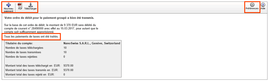 Une fois les données transmises, un récapitulatif du paiement groupé s’affichera.